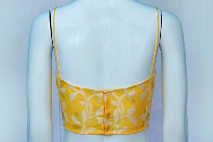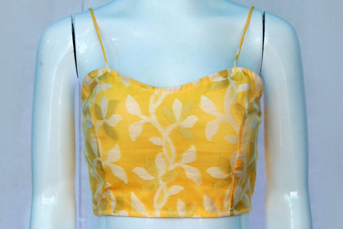 This is a Yellow Color Jamdani Spaghetti. It is Single Spaghetti Strap with Semi Sweetheart Neckline in Frontside and Band Neckline in Backside. It is Princess Cut and Padded Blouse and Back Open. You can team it up with any contrast or printed saree.