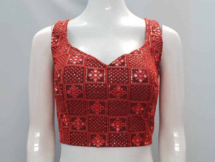 This is a Red Color Georgette Embroidered Blouse. This Blouse is Sweet Heart Neckline in Frontside & U- Neckline in Backside with Tie-Up. This is a Princess Cut, Padded Blouse. This Blouse is Sleeveless and Back Open. You can team it up with any contrast-colored Traditional/Fancy Saree.