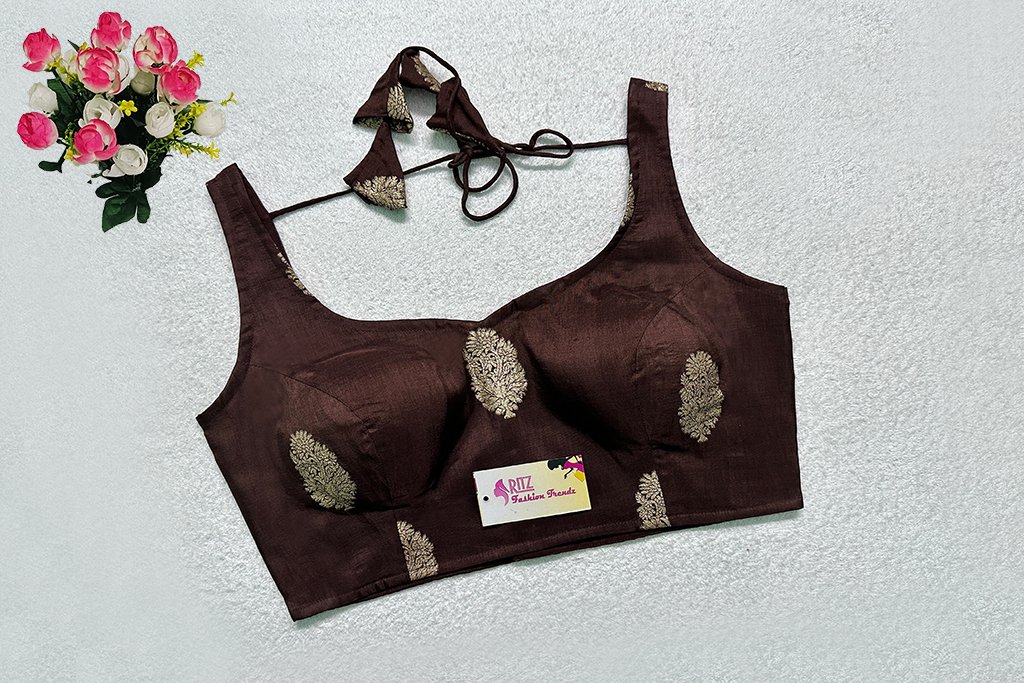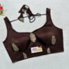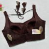 This is a Chocolate Color Russian Silk Blouse. This is Leaf Neckline in both Frontside & Backside with Tie-Up. This is a Princess Cut, Padded, Sleeveless Blouse with Back Open. You can team it up with any contrast-colored Traditional/Printed Saree.