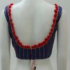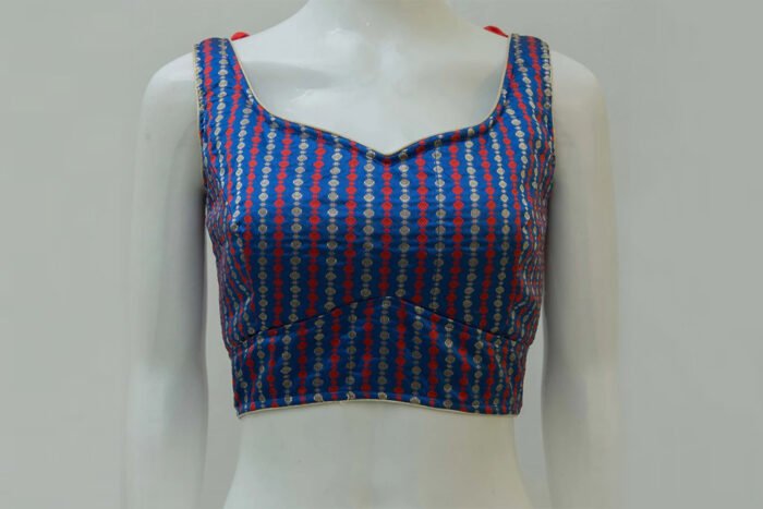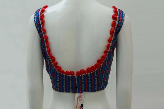 This is a Blue Multi Color Brocade Blouse with Thread Work. This Blouse Sweetheart Neckline in Front and Back is Deep-U with Red Round Folded Ribbon Lace Patchwork. It is a Alit Cut Padded Blouse. It is Sleeveless and Back Open. You can team it up with contrast color Banarasi Saree or other Traditional/Fancy Saree.