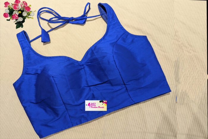 This is a Royal Blue Color Samo Silk Blouse. It is Sweetheart Neckline in Frontside and U-Neckline in Backside with Tie-Up. This is a Princess Cut, Padded, Sleeveless Blouse with Back Open. You can team it up with any contrast colored Printed/Traditional Saree.