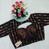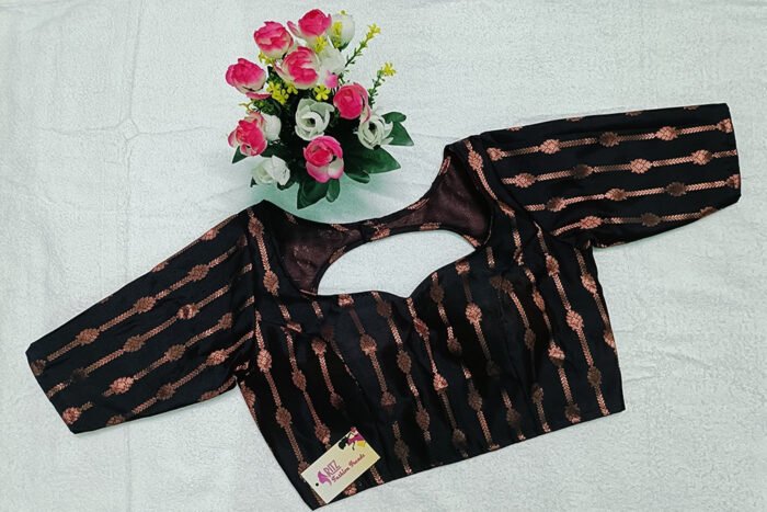 This is a Copper & Brown Color Brocade Blouse. This Blouse is Sweetheart Neckline in Frontside and Keyhole Neckline in Backside. This is a Princess Cut, Padded, Glass Sleeve Blouse with Back Open. You can team it up with any contrast colored Printed or Traditional Saree.