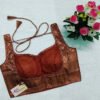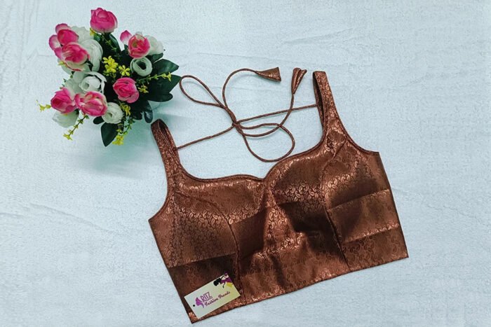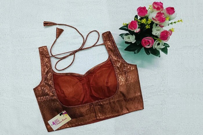 This is a Copper Color Brocade Blouse. This Blouse is Sweetheart Neckline in Frontside and U-Neckline in Backside with Tie-Up. This is a Princess Cut, Padded, Sleeveless Blouse with Back Open. You can team it up with any contrast colored Printed or Traditional Saree.