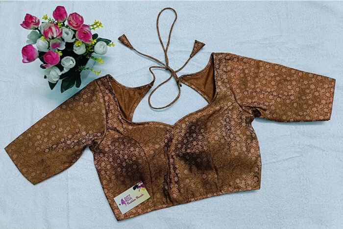 This is a Copper Color Brocade Blouse. This Blouse is Sweetheart Neckline in Frontside and Keyhole Neckline in Backside with Tie-Up. This is a Princess Cut, Padded, Glass Sleeve Blouse with Back Open. You can team it up with any contrast colored Printed or Traditional Saree.