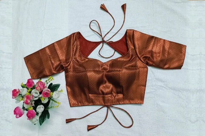 This is a Copper Color Brocade Blouse. This Blouse is Semi-Sweetheart Neckline in Frontside and Keyhole Neckline in Backside with Tie-Up. This is a Princess Cut, Padded, Glass Sleeve Blouse with Back Open. You can team it up with any contrast colored Printed or Traditional Saree.