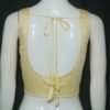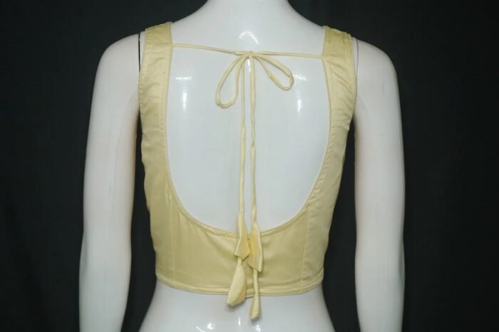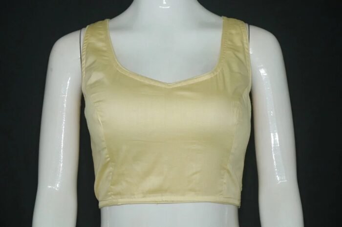 This is a Cream Color Samo Silk Blouse. This Blouse is Sweetheart Neckline in Frontside & U-Neckline in Backside with Tie-Up. This is a Princess Cut, Padded, Sleeveless Blouse with Back Open and Pleated Design with Net in Front Neckline. You can team it up with any contrast-colored Traditional/Printed Saree.