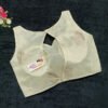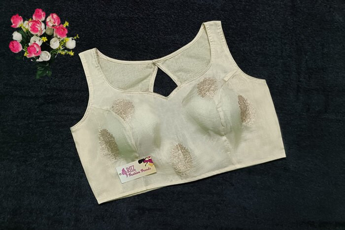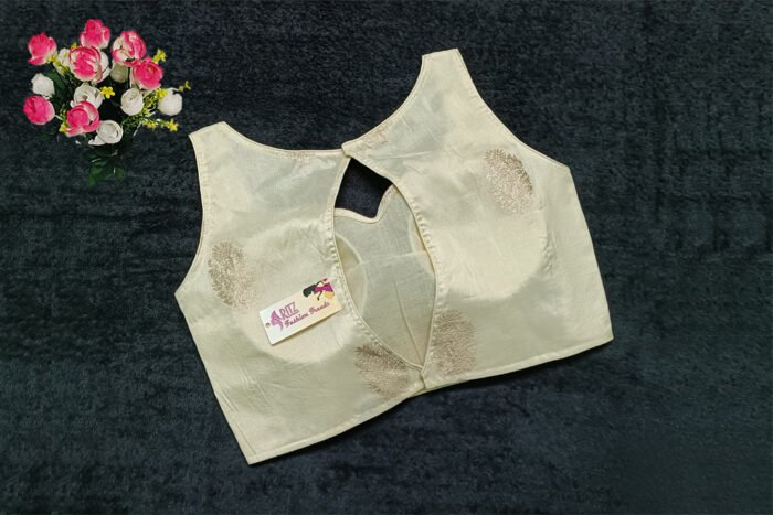 This is a Cream Color Russian Silk Blouse. This Blouse is Sweetheart Neckline in Frontside & Keyhole Neckline in Backside. This is a Princess Cut, Padded, Sleeveless Blouse with Back Open. You can team it up with any contrast-colored Traditional/Printed Saree.