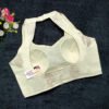 This is a Cream Color Russian Silk Blouse. This Blouse is Double Strap Halter Neckline in Frontside & Backside with Mandarin Collar. This is a Princess Cut, Padded, Sleeveless Blouse with Back Open. You can team it up with any contrast-colored Traditional/Printed Saree.