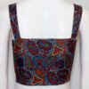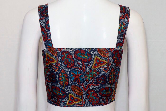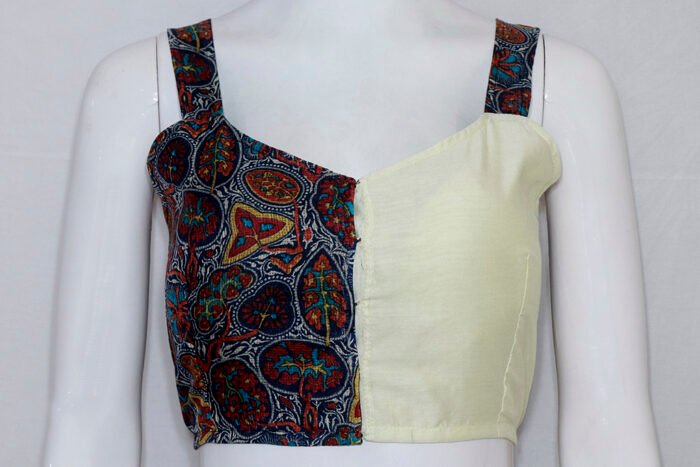 This is an Off-White Multi Color Raw Silk with Printed Rayon Blouse. It is V-Neckline in Frontside and Square Neckline in Backside. This is a Princess Cut Padded Blouse. This Blouse is Sleeveless and Front Open. You can team it up with any Contrast Colored Traditional Saree.