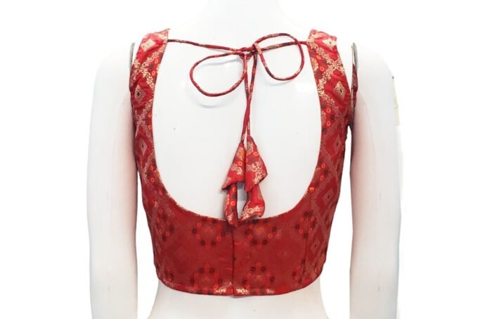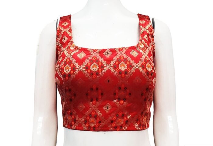 This is a Red Multi Color Meena Kari Brocade Benarasi Blouse. This Blouse is Rounded Square Neckline in Frontside & U-Neckline in Backside with Tie-Up. This is a Princess Cut, Padded, Sleeveless Blouse with Back Open. You can team it up with any contrast-colored Traditional/Printed Saree.