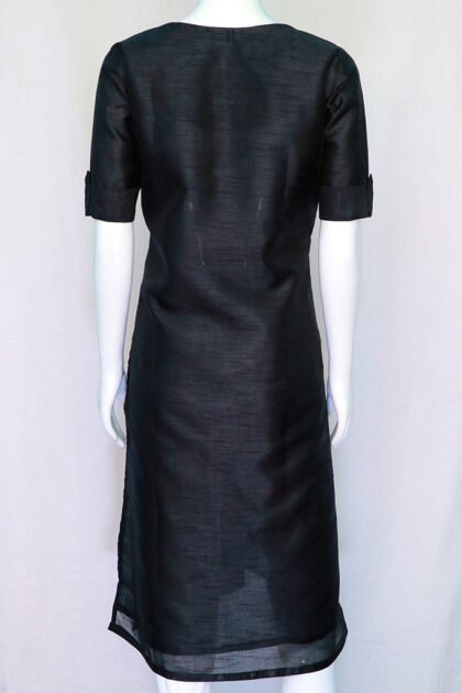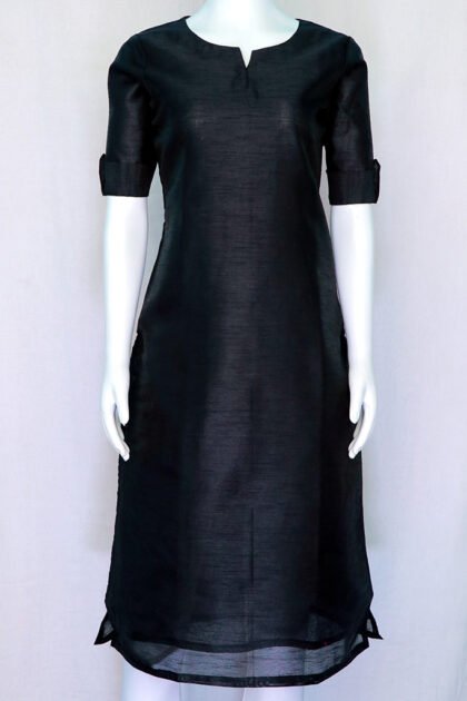 This is a Crimson Red Color 3Ply Pure Silk Kurti with Nice Dual Tone Texture. It is Round Neckline in Frontside and Backside. This Kurti is Sleeveless and Knee Length.