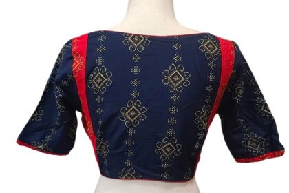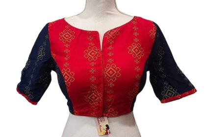 This Blouse Comes in Red Color Rubia Cotton with Motif (Durga) Hand-Painted. This Blouse is V-Neckline in Frontside and Boat Neckline in Backside with Hakoba Lace Work. This Blouse is Choli Cut Non-Padded Blouse. It is a Glass Sleeve Blouse with Front Open. You can team it up with any contrast colored Printed or Traditional Saree.