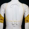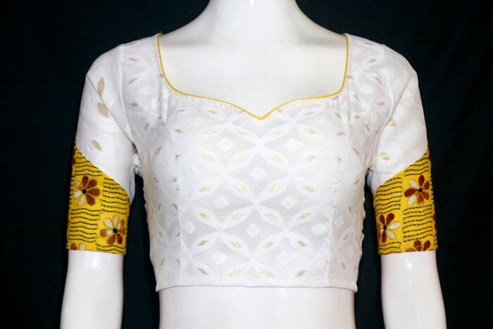 This is a White Multi Color Jamdani with Multi Color Patch Work. It is Sweetheart Neckline in Frontside and U-Neckline in Backside with Tie Up. This is a Princess Cut Padded Blouse. This Blouse is Glass Sleeve and Back Open. You can team it up with any contrast colored Printed or Traditional Saree.