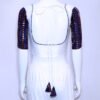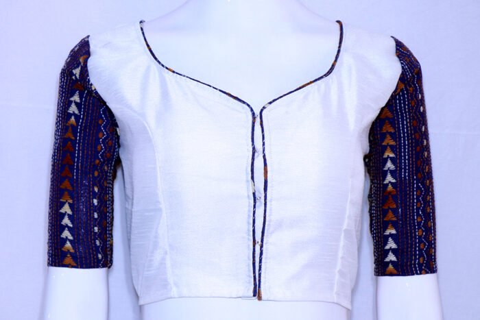 This is a White Color Raw Silk Blouse with Abstract Motif Kantha Stitch Embroidery in Sleeves. This Blouse is Sweetheart Neckline in Frontside and U-Neckline in Backside with Tie-Up. It is a Princess Cut Padded Blouse. This Blouse is Glass Sleeve and Front Open. You can team it up with any contrast colored Traditional Saree.