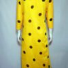 This is a Dandelion Yellow Color Raw Silk Kurti with Midnight Black Color Large Polka Dot Digital Print. It is Round Neckline in Frontside and High Neckline in Backside. This Kurti is 3/4 Sleeve and Knee Length.