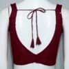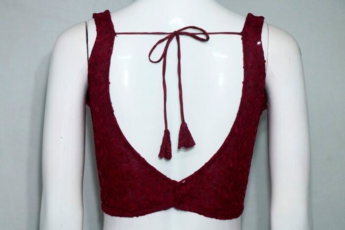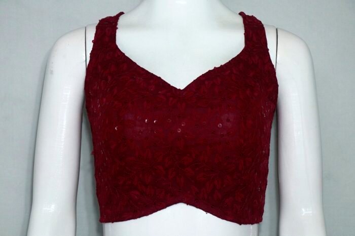 This is a Maroon Color Georgette Chikan Kari and Sequin Embroidered Blouse. It is Leaf Neckline in both Frontside and Leaf Neckline in Backside with Tie Up. This is a Princess Cut Padded Sleeveless Blouse with Back Open. You can team it up with any contrast-colored Traditional Saree.
