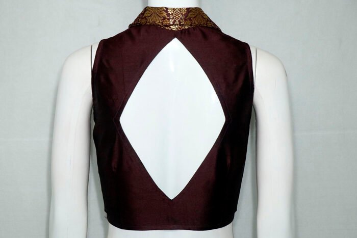 This is a Wine Color Samo Silk Blouse with Zari Work in Neckline. This Blouse is Halter Arrow Neckline in Frontside and Keyhole Neckline in Backside with Mandarin Collar. This is a Princess Cut Padded Sleeveless Blouse with Front Open. You can team it up with any contrast colored Traditional Saree.