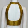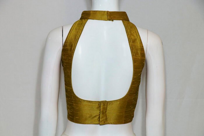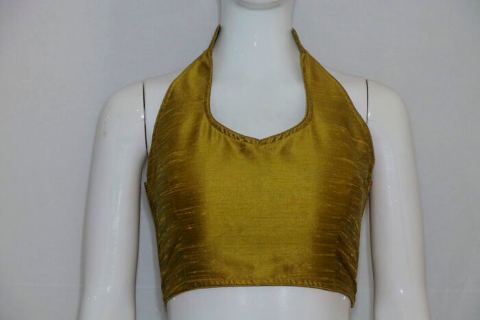 This is a Mustard Color Raw Silk Sleeveless Blouse. It is Halter Arrow Neckline in Both Frontside and Backside with Mandarin Collar. This is a Princess Cut Padded Blouse. This Blouse is Sleeveless and Back Open. You can team it up with any contrast colored Printed or Traditional Saree.
