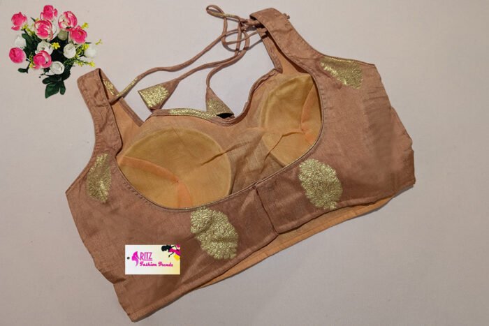 This is a Dark Peach Color Russian Silk Blouse. This Blouse is Sweetheart Neckline in Frontside & U-Neckline in Backside with Tie-Up. This is a Princess Cut, Padded, Sleeveless Blouse with Back Open. You can team it up with any contrast-colored Traditional/Printed Saree.