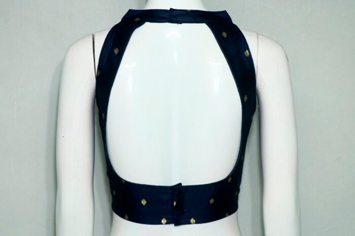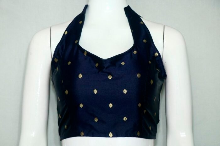 This is a Navy Blue Color Taffeta Silk Blouse with Polka Dots Motif Zari Work. It is Halter Arrow Neckline in Both Frontside and Backside with Mandarin Collar. This is a Princess Cut Padded Blouse. This Blouse is Sleeveless and Back Open. You can Team it up with any contrast-colored Traditional Saree.
