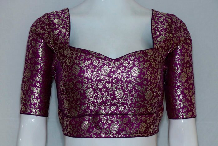 This is a Purple Color Pure Benarasi with Nice Natural Motif Zari Work Blouse. It is Sweet Heart Neckline in Frontside and Backside with Tie Up. This is a Princess Cut Padded Blouse. This Blouse is Glass Sleeve and Back Open. You can team it up with any contrast colored Traditional Saree.