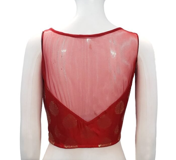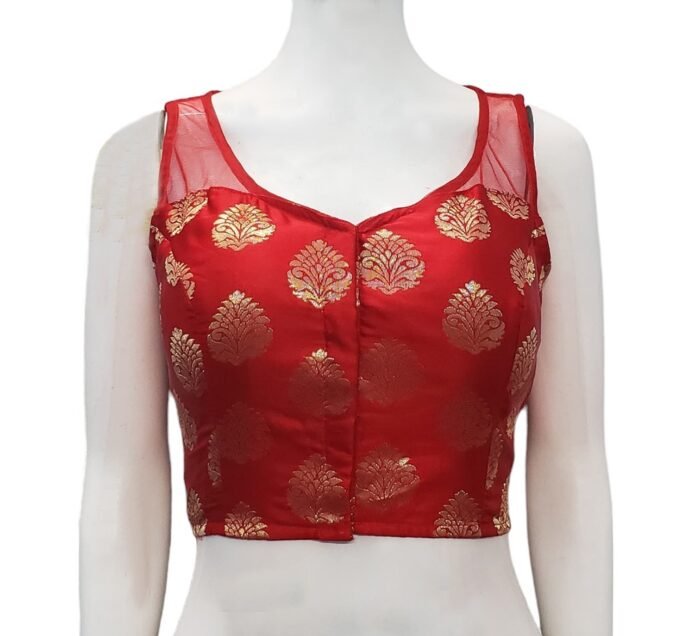 This is a Red Color Satin Benarasi Blouse. This Blouse is Leaf Neckline in Frontside & Illusion Boat Neckline Backside. This is a Princess Cut, Padded, Sleeveless Blouse with Front Open. You can team it up with any contrast-colored Traditional/Fancy Saree.