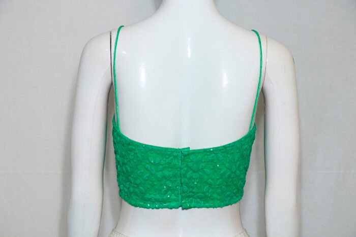This is a Green Color Net Spaghetti with Thread & Sequin Embroidery. It is a Single Spaghetti Strap Blouse with Semi Sweetheart Neckline in Frontside and Band Neckline in Backside. This is a Princess cut Padded Blouse with Back Open. You can team it up with any contrast or Printed or Traditional Saree.