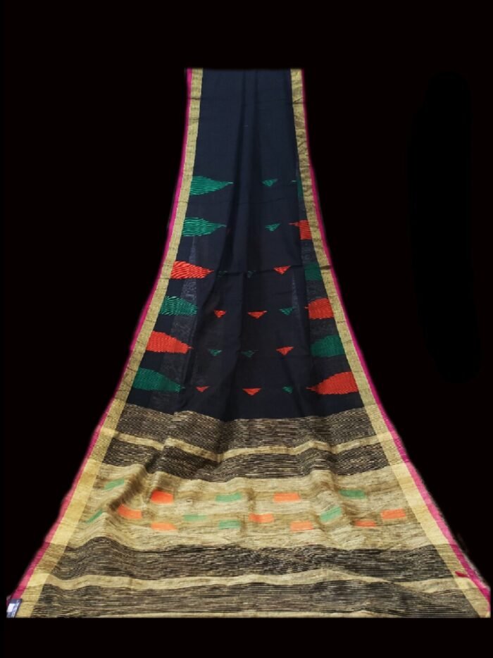 Denim Blue Color Handloom Cotton Silk Saree with Contrast Multicolor Thread work