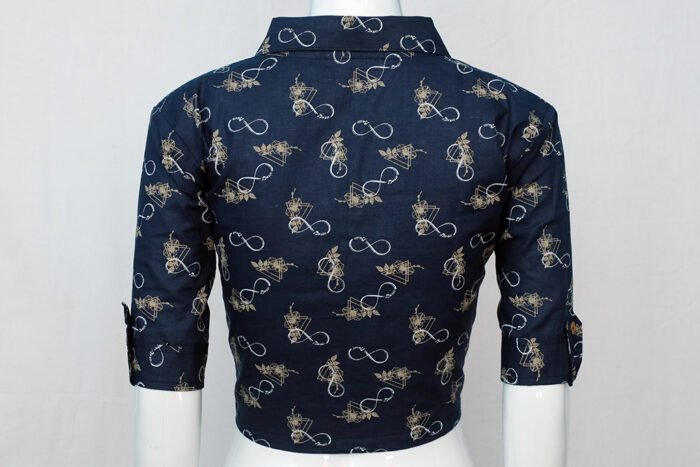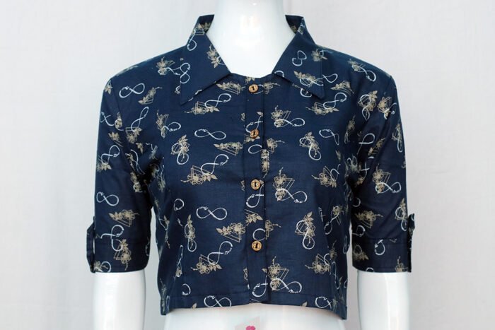 This is a Denim Blue Color Rayon with Contrast Color Natural Motif Digital Printed Shirt Blouse and can also be used as a Crop-Top. It is Formal Wing Collar. This Blouse is Button Tab Sleeve and Front Open. You can team it up with any contrast colored saree.
