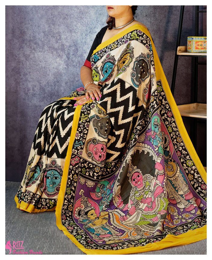 White & Black Color Hand Painted Kalamkari Saree