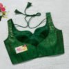 This is an Emerald Green Color Brocade Blouse. This is Sweetheart Neckline in Frontside & Leaf Neckline in Backside with Tie-Up. This is a Princess Cut, Padded, Sleeveless Blouse with Back Open. You can team it up with any contrast-colored Traditional/Printed Saree.