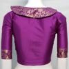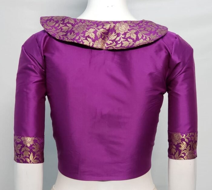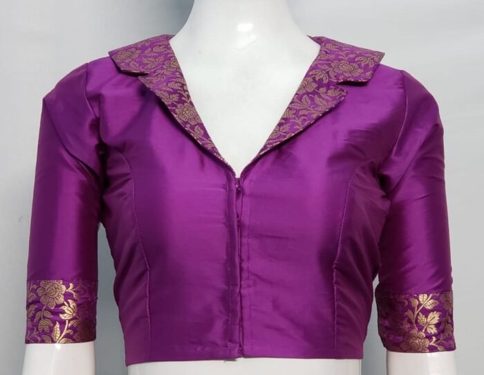 This is a Purple Color Samo Silk Brocade Blouse. This Blouse is V-Neckline in Frontside and High Neckline in Backside with Collar. This is a Princess Cut, Non-Padded, Glass Sleeve Blouse with Front open. You can team it up with any contrast colored Printed or Traditional Saree.