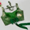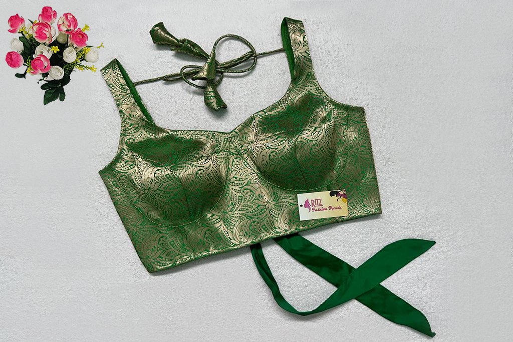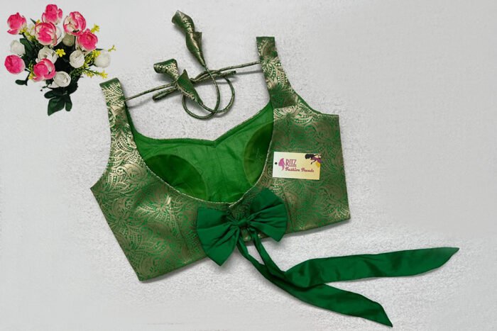 This is an Emerald Green Color Brocade Blouse. This is a Sweetheart Neckline Blouse in Frontside & U-Neckline in Backside with Tie-Up & a Bow. This is a Princess Cut, Padded, Sleeveless Blouse with Back Open. You can team it up with any contrast-colored Traditional/Printed Saree.