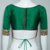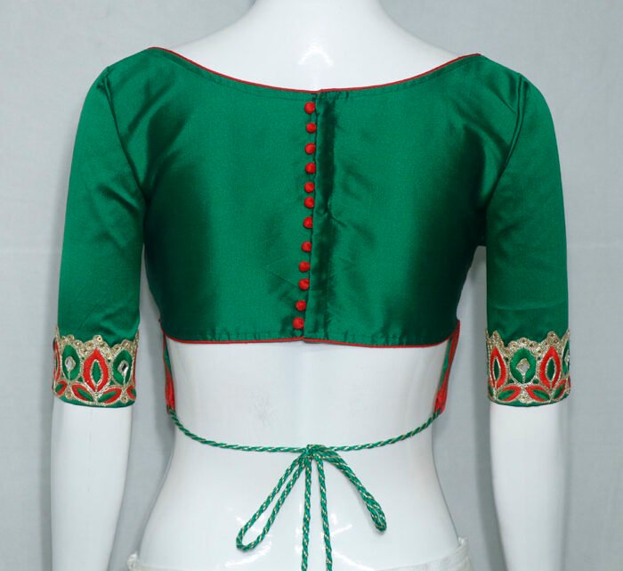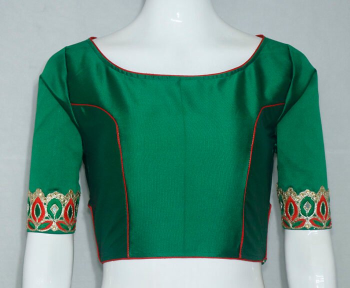 This is an Emerald Green Color Samo Silk Blouse With Zari Lace Embroidery In Sleeves. This Blouse is a Glass Sleeve Blouse with Boat Neckline in Frontside and High Neckline in Backside with Tie Up. This is a Princess Cut Padded Blouse with Back Open. You can team it up with any contrast colored Traditional Saree.