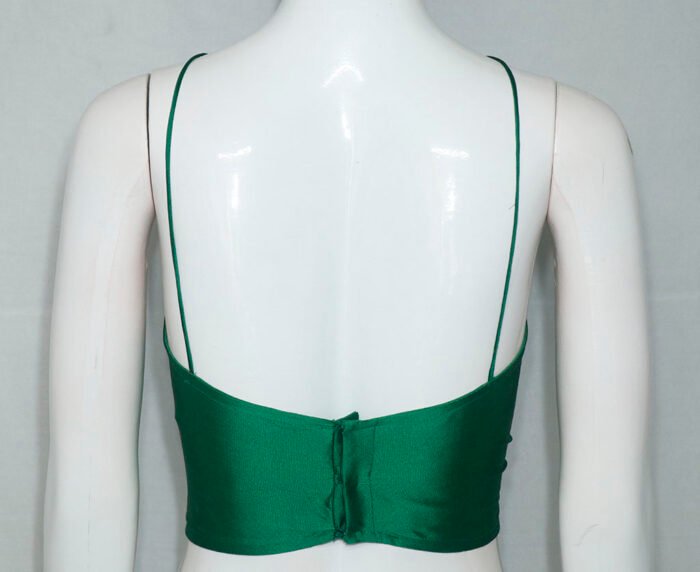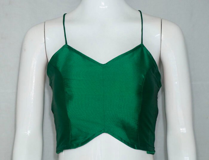 This is an Emerald Green Color Samo Silk Spaghetti. This is a Single Spaghetti Strap Blouse with V- Neckline in Frontside and Band Neckline in Backside. This is a Princess Cut Padded Blouse with Back Open. You can team it up with any contrast colored Traditional/Fancy Saree.