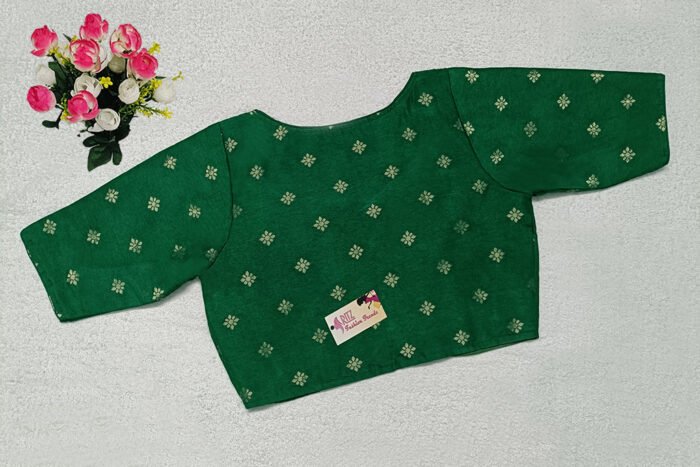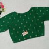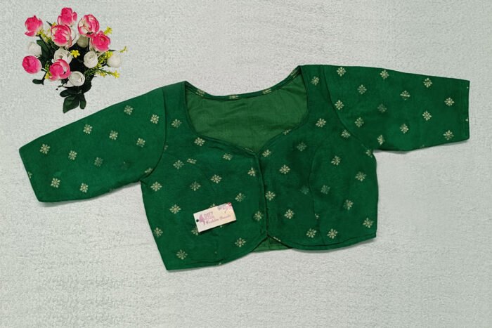 This is an Emerald Green Color Russian Silk Blouse. This Blouse is Sweetheart Neckline in Frontside & Boat-Neckline in Backside. This is a Princess Cut, Non-Padded, Glass Sleeve Blouse with Front Open. You can team it up with any contrast-colored Traditional/Printed Saree.