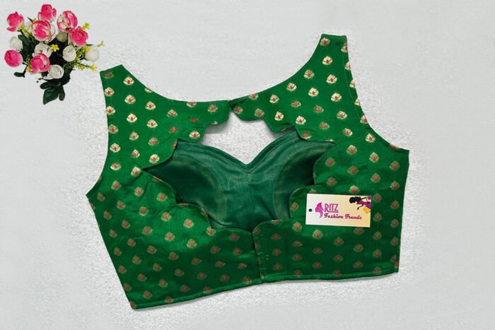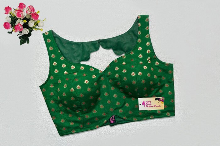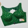 This is an Emerald Green Meena Kari Chanderi Silk Blouse. This is a Sweetheart Neckline Blouse in Frontside & Kay-hole Neckline in Backside. This is a Princess Cut, Padded, Sleeveless Blouse with Back Open. You can team it up with any contrast-colored Traditional/Printed Saree.