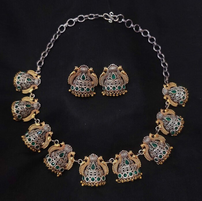This is Look like a Royalty in this Exquisite Silver and Gold Plated Enamel Premium Quality Crystal Stone Necklace Set. The set is Enhanced with Emerald Green stones.