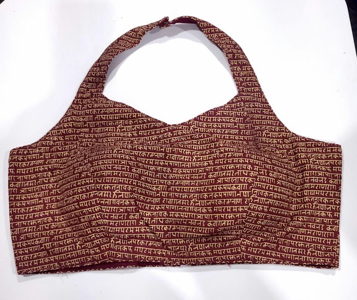 This is a Dark Maroon and Yellow Color Cotton Blouse with Contrast Color Script Motif Digital Print. It is Halter Arrow Neckline in Frontside and Band Neckline in Backside with Mandarin Collar. It is Princess Cut and Padded Blouse. This Blouse is Sleeveless and Back Open. You can team it up with any contrast color Saree.