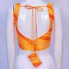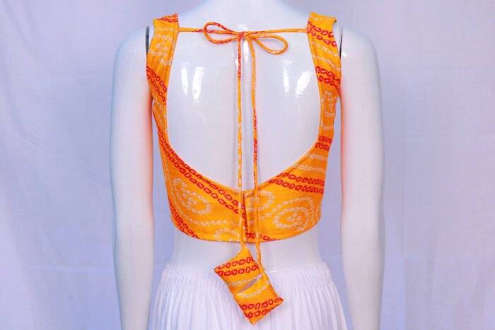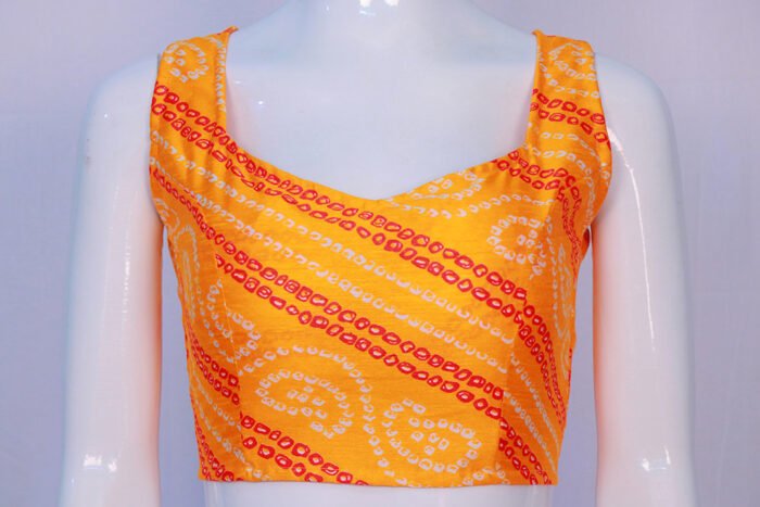 This is a Yellow Multicolor Art Muslin Blouse with Contrast Color Abstract Motif Bandhni Print. It is Arrow Neckline in Frontside and Backside with Tie Up. This is a Princess Cut Padded Blouse. This Blouse is Sleeveless and Back Open. You can team it up with any contrast colored Traditional saree.