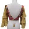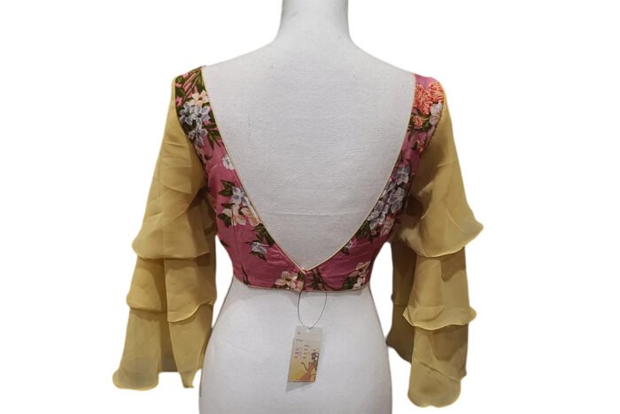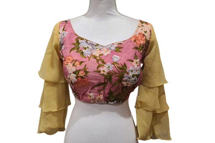This is a Pink Multi Color Art Silk Blouse with Georgette. It is a Sweetheart Neckline in Frontside and Deep-V Neckline in Backside. It is Princess Cut and Padded Blouse. This Blouse is Georgette Ruffle Sleeve with Back Open. You can team it up with any contrast colored saree.