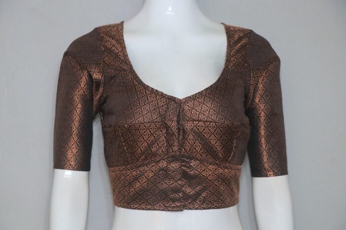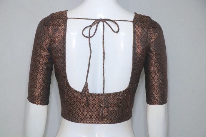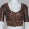 This is Copper Color Brocade. It is U Neckline in Frontside and Rounded Square Neckline in Backside with Tie Up. A Beautiful Brocade Blouse Is Made Of Very Soft Silk Brocade Fabric. This is a Non-Padded Choli Cut (Used Sponge) Blouse and Opens From The Front And Has Elbow Length Sleeves. There Is Enough Margin In Each Blouse To Make It Bigger By a Few Inches. It Is Lined With Pure Cotton. This Blouse Is Fully Stitched and Ready To Wear. We assure the authenticity and quality of our products. You can team it up with any contrast-colored Traditional Saree.