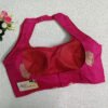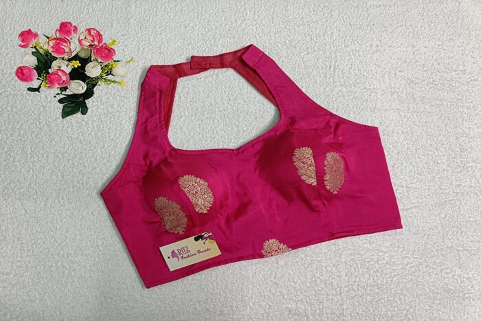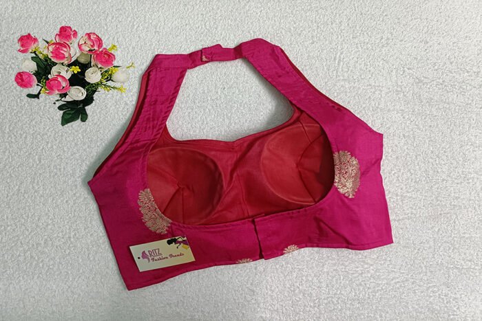 This is a Fuchsia Pink Color Russian Silk Blouse. This Blouse is Double strap Halter Neckline in both Frontside & Backside. This is a Princess Cut, Padded, Sleeveless Blouse with Back Open. You can team it up with any contrast-colored Traditional/Printed Saree.