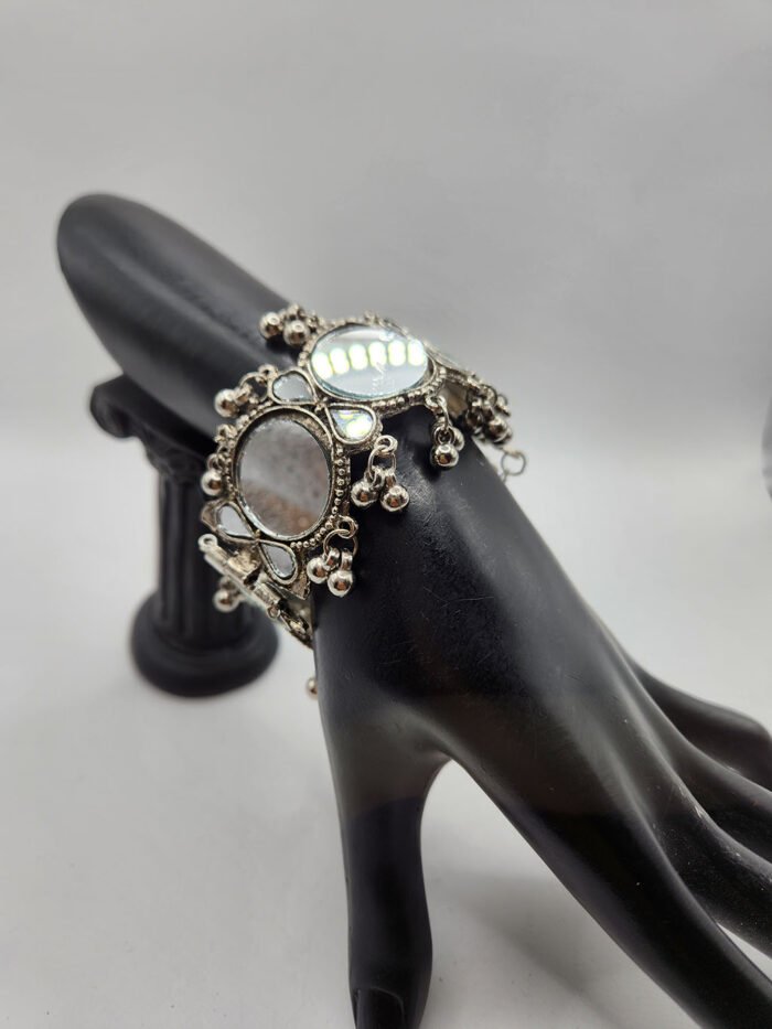 German Silver Bracelet with Mirror & Beads. It looks very modern & Stylish. You Can Team It Up With Both Western & Indian Outfits.
