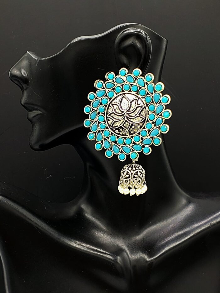 German Silver Jhumka With Blue Stones & White Pearl Beads. This Ear-Ring will look Wonderful with Fancy & Traditional Saree. You can wear this Ear-ring Easily.