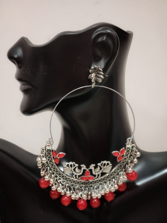 German Silver Earring with Red Color Beads & Stone. This Trendy Earring will look Wonderful with Fancy Saree. You can wear this Beaded Earring Easily.