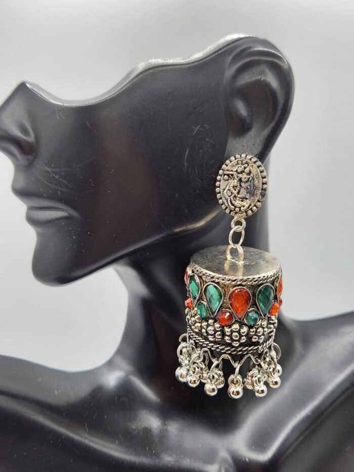 German Silver Multi Color Jhumka. This Stylish Jhumka will look Wonderful with Fancy & Traditional Saree. You can wear this Earring Easily.