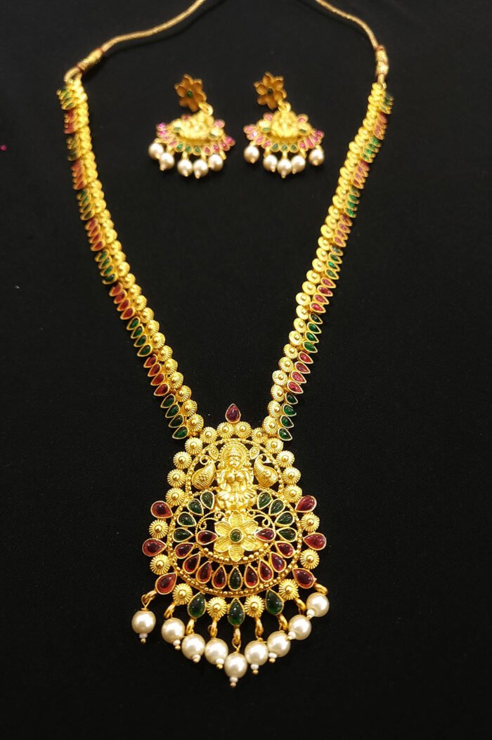 Gold Plated Kundan Necklace Set with Pearl Beads.
