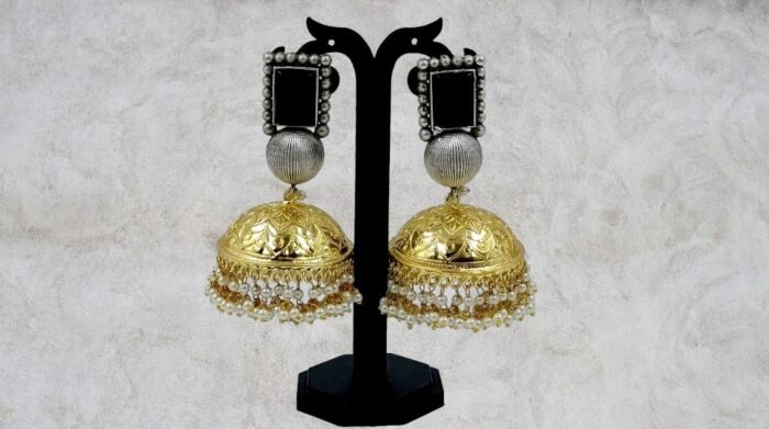 Gold Polish Jhumka With Pearl Beads & Stone.