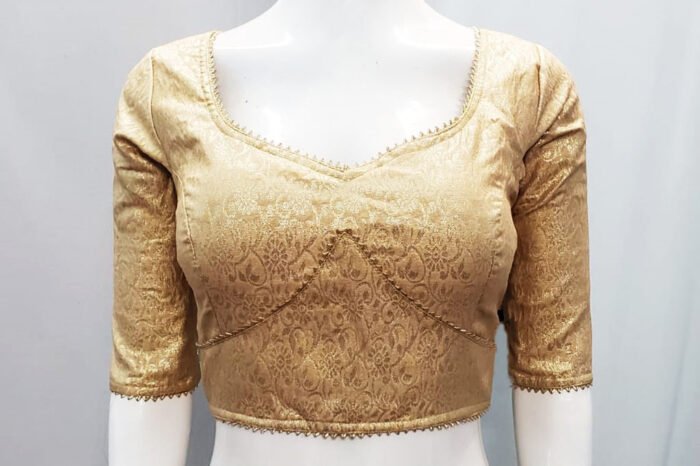 This is a Golden Color Brocade Blouse. This Blouse is Sweet Heart Neckline in Frontside & U-Neckline in Backside with Tie-Up. This is a Princess Cut, Padded Blouse. This Blouse is Glass Sleeve and Back Open. You can team it up with any contrast-colored Traditional/Fancy Saree.